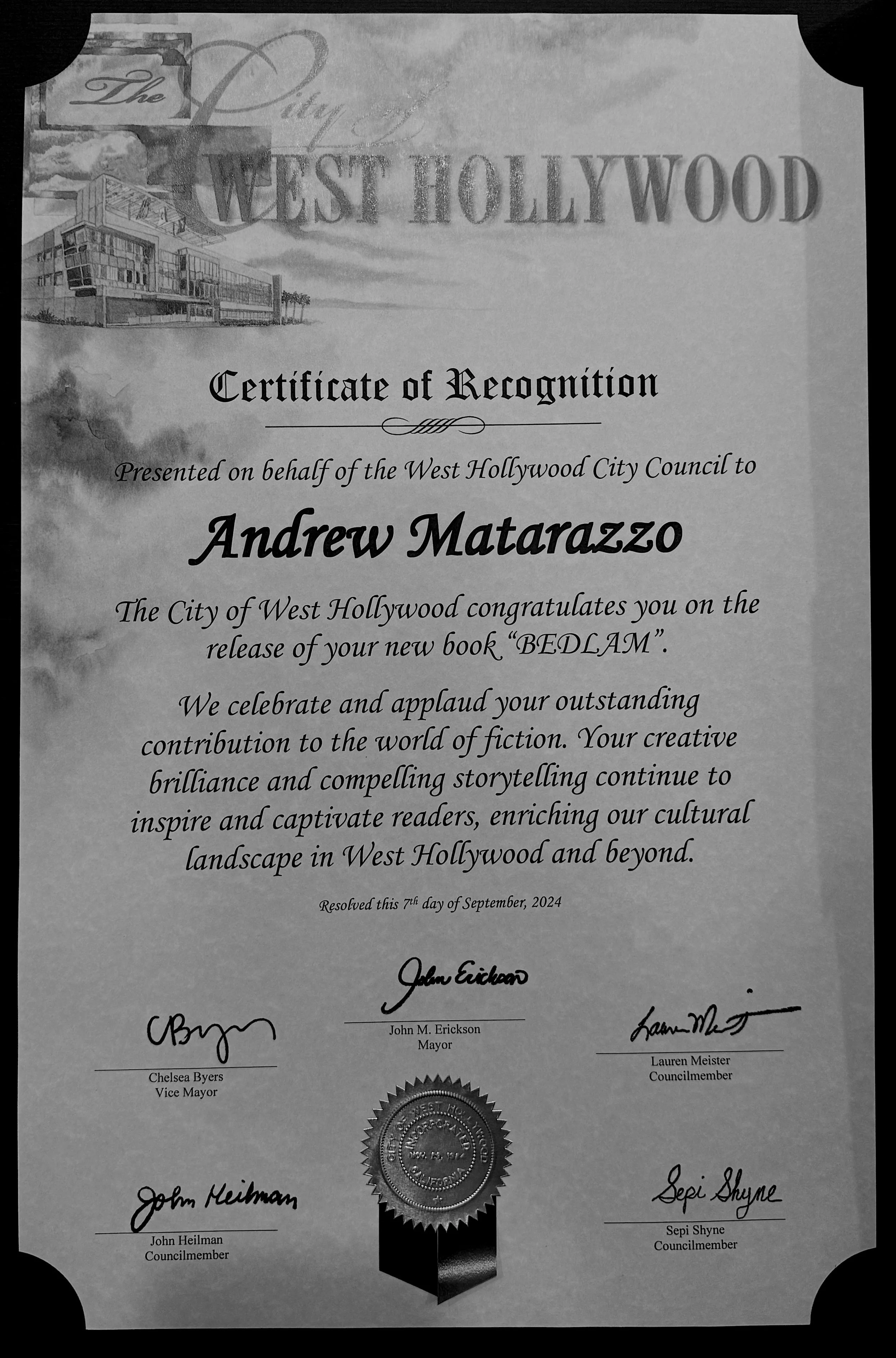 His latest work comes in the form of his apocalyptic fiction novels BEDLAM and the follow up title, SWEVEN, found in leading bookstores alongside Barnes & Noble and Amazon worldwide. He was recently honored with a Certificate of Recognition for his writing contributions by the mayor of West Hollywood.